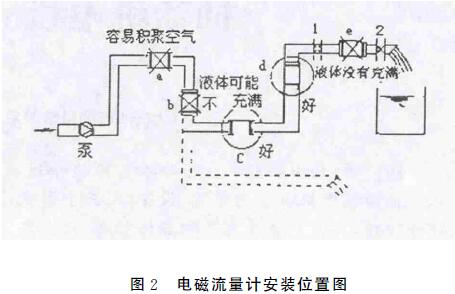 3.2.4對于電極可拆卸的儀表在安裝時(shí)方向錯(cuò)誤。部分污水流量計(jì)的電極并非安裝在表體測量管壁上,而是與表頭一體并可拆卸,在安裝時(shí)要注意兩個(gè)電極的連線應(yīng)與液體流向保持垂直。3.2.5液體未充滿管道,電極之間含有氣體。管道未充滿液體主要是管網(wǎng)工程設(shè)計(jì)或儀表安裝位置不當(dāng),使傳感器測量管內(nèi)不能充滿液體。應(yīng)避免安裝如圖所示a、e的位置和以虛線管排放時(shí)b位置,改裝到c,d位置較好。水平安裝時(shí)應(yīng)使電極的連線保持水平,如果電極一上一下,下部電極會由于介質(zhì)內(nèi)雜質(zhì)沉淀覆蓋電極,上部電極會由于氣泡堆積造成電極與介質(zhì)絕緣。垂直安裝時(shí)應(yīng)裝在流體自下而上流動的管道上,這樣更容易使液體充滿管道。