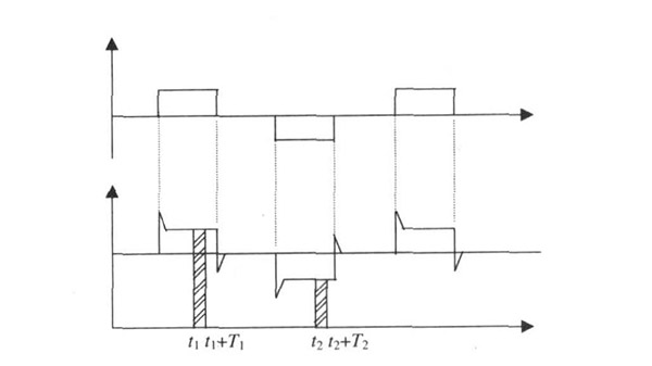 景觀給水流量計(jì)一般都采用工頻交流電源供電, 其電源電壓的幅值和頻率的變化都會給景觀給水流量計(jì)帶來電源性干擾噪聲。對電源電壓的幅值變化, 因采用多級集成穩(wěn)壓, 一般而言電源電壓的幅值變化對電磁流量的測量精度影響不大。當(dāng)電源電壓的頻率波動時(shí), 雖然其波動范圍有限, 但對景觀給水流量計(jì)測量精度影響較大。為了解決工頻干擾問題, 實(shí)現(xiàn)對流體流速感應(yīng)電勢eab信號的準(zhǔn)確測量, 需利用以下基本關(guān)系:①勵(lì)磁周期為工頻周期的整數(shù)倍, 即勵(lì)磁頻率為50/nHz(n為偶數(shù));②正負(fù)勵(lì)磁下的同相位采樣。圖2是對應(yīng)低頻矩形波勵(lì)磁形式下的典型電勢信號形式, 按上述關(guān)系在一個(gè)勵(lì)磁周期下, 若假設(shè)t1 和t2 點(diǎn)為工頻干擾的等效干擾點(diǎn), 且采樣寬度T=T1 =T2 , 則eab的基本算式為:
