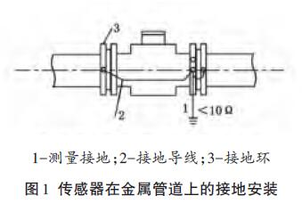 傳感器安裝在塑料管道或內壁有絕緣涂層、襯里的管道上,兩端應安裝接地環(huán)(或帶有接地電極的金屬短管),然后用導線連接,使管內流動的介質與大地短路,具有零電位(見圖2)。