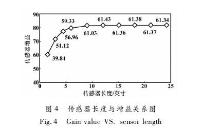 采用一臺日徑為6英寸、標(biāo)準(zhǔn)線圈的傳感器,改變傳感器長度,依次進(jìn)行試驗(yàn)室標(biāo)定試驗(yàn)。傳感器長度與增益的關(guān)系圖如圖4所示。當(dāng)傳感器長度為9. 1英寸時,其增益為61. 03;但當(dāng)其長度繼續(xù)增加時,增益變化較小;當(dāng)其長度6. 1英寸減小到0時,增益從59. 33開始下降。也就是說,當(dāng)傳感器長度為6. 1-9. 1英寸時,既有效利用了線圈產(chǎn)生的磁場,又可使傳感器長度較短。