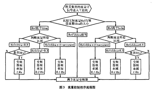 實(shí)際生產(chǎn)中流量一直在某個(gè)區(qū)域內(nèi)波動(dòng),且其動(dòng)態(tài)特性不易掌握。從上面的理論中我們能夠讓誤差△£盡可能的小,這樣距我們所需要的理論值%就越接近。而減小誤差需要我們把n取的盡可能大,也就是在生產(chǎn)時(shí)間內(nèi)劃分更多的周期去調(diào)節(jié)流量。當(dāng)工控機(jī)根據(jù)工業(yè)污水印染廢水流量計(jì)傳送回來的信號(hào)發(fā)出調(diào)節(jié)變頻器工作頻率的指令后,電機(jī)調(diào)整功率到工業(yè)污水印染廢水流量計(jì)的實(shí)際測(cè)量為一個(gè)工作周期,我們知道從指令發(fā)送到實(shí)際測(cè)量值返回有一個(gè)較大的滯后,如果調(diào)節(jié)的周期時(shí)間小于流量計(jì)本身的一個(gè)工作周期,那么顯然不可能達(dá)到減小誤差的目的。利用模糊控制思想H。,在控制程序中我們把流量的波動(dòng)區(qū)域劃分為±缸×Yo,Yo-t-O.3,Yo±0.5四個(gè)區(qū)域,其中缸為可調(diào)節(jié)的誤差范圍,生產(chǎn)中我們?nèi)?.015,流量區(qū)域劃分的單位均為t/h。針對(duì)不同的區(qū)域采取不同的調(diào)整方案。具體流程如圖3所示。圖中變量Rel表示實(shí)際測(cè)量的流量,變量Idea表示理論流量。