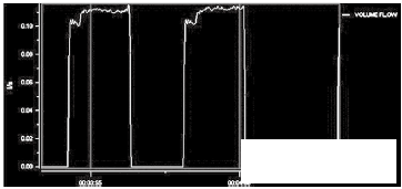 灌裝頭的*終出口部分為10~14mm的可更換縮口。通過縮口,可以產(chǎn)生背壓,一般縮口內(nèi)置蜂窩狀虹吸管,保證灌裝前后的管道滿管。從測試的流量波形上看,10mm的灌裝頭產(chǎn)生適當?shù)淖枘嵝Ч髁壳€較穩(wěn)定。