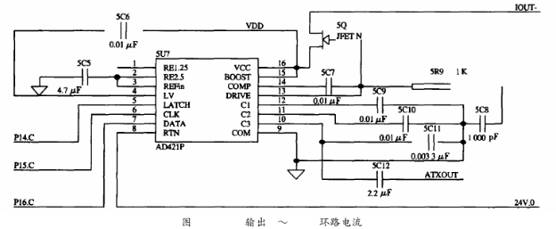 HT2012需要外部提供460.8kHz的時(shí)鐘信號(hào),且要求時(shí)鐘頻率的誤差是0.1%,若直接入一個(gè)460.8kHz的晶振不僅會(huì)引起系統(tǒng)功耗的增加,而且該晶振屬于非標(biāo)準(zhǔn)晶振,需專門定制。為了解決這一問題,在系統(tǒng)中采用一片1.8432MHz的晶振以產(chǎn)生時(shí)鐘信號(hào),再經(jīng)分頻器CD4013進(jìn)行4分頗,可輸出1.8432MHz/4=460.8kHz的分頻信號(hào)供HT2012使用。AD421其內(nèi)部的電壓調(diào)節(jié)器與外部的場效應(yīng)管DN25D對(duì)輸入到AD421的電壓進(jìn)行調(diào)整,可提供+3.3V電壓作為其他設(shè)備的電源。HART發(fā)出的FSK信號(hào),經(jīng)過一個(gè)電容耦合送到AD421中,轉(zhuǎn)換成相應(yīng)的0.5mA正弦電流信號(hào),實(shí)現(xiàn)電壓信號(hào)到電流信號(hào)的轉(zhuǎn)換,同時(shí),疊加在4~20mA的電流上送給接收設(shè)備,實(shí)現(xiàn)了HART協(xié)議的信息的交換。本電路耦合電容取為0.0033μF,如圖5所示。