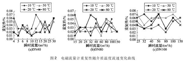 將實(shí)驗(yàn)測(cè)得的dn150深井水流量計(jì)在不同溫度及流速下的重復(fù)性數(shù)據(jù)整理,特性曲線如圖2所示,3組曲線分別對(duì)應(yīng)DN40、DN80、DN100的3塊dn150深井水流量計(jì)的重復(fù)性曲線。