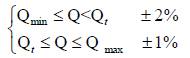由圖2 可見,儀表系數(shù)可分為二段,即線性段和非線性段。在非線性段, 實(shí)際特性受軸承摩擦力、流體粘性阻力影響較大。當(dāng)流量低于Qmin 時(shí),儀表系數(shù)隨著流量迅速變化。壓力損失與流量的平方成正比關(guān)系。通常線性段約為工作段的2/3,其特性與渦輪結(jié)構(gòu)參數(shù)及流體粘性有關(guān)。隨流量的變化其儀表系數(shù)K 也會(huì)有一定的變化,但變化不大,通常將其變化幅度稱為流量計(jì)的計(jì)量準(zhǔn)確度。對(duì)于產(chǎn)品設(shè)計(jì)而言,期望能將線性段的流量范圍拓展,一臺(tái)流量計(jì)能覆蓋同口徑的不同流量范圍,使得產(chǎn)品量程比變寬從而降低生產(chǎn)管理與生產(chǎn)批量加工成本。對(duì)于1.0 級(jí)的高壓機(jī)油流量計(jì),以Qt(0.2Qmax)為分界流量點(diǎn),將計(jì)量線性分為兩段,其中一段的*大允許誤差為±2%,而另一段的*大允許誤差為±1% 。按圖2 所示,通常每臺(tái)渦輪流量計(jì)均有較為相似特性曲線,若將可測(cè)量流量范圍做寬,就能在同口徑不同流量范圍進(jìn)行分段截取,以實(shí)現(xiàn)一臺(tái)流量計(jì)能覆蓋同口徑的不同流量范圍。