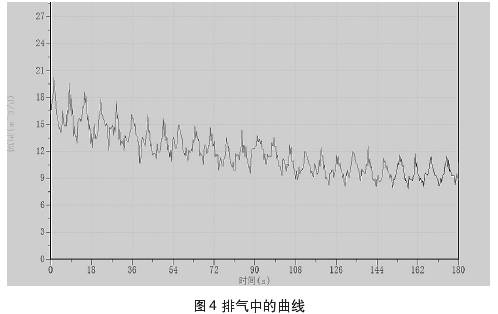 圖4、圖5中所示曲線為測(cè)量過(guò)程中所截取的集流傘中所聚集的氣相,通過(guò)排氣通道排出時(shí)與排出后的測(cè)量曲線。測(cè)試過(guò)程中錄取到的儀器排氣的過(guò)程,當(dāng)集流傘完全支開(kāi)后仍需要開(kāi)啟流量測(cè)試進(jìn)行實(shí)時(shí)檢測(cè),否則可能會(huì)錄取資料失真。