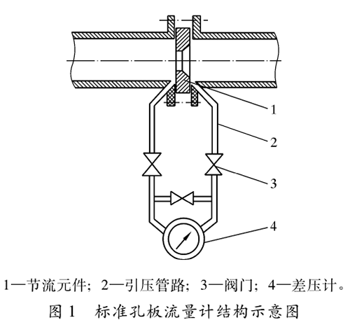 標(biāo)準(zhǔn)二氧化碳流量計(jì)結(jié)構(gòu)如圖1所示,包括節(jié)流元件(標(biāo)準(zhǔn)孔板及其取壓裝置)、傳輸壓差信號的引壓管路、閥門以及差壓計(jì)等部分。標(biāo)準(zhǔn)孔板是壓差測量時(shí)的一次元件,人們利用它在管道內(nèi)使流體產(chǎn)生壓差,再通過引壓管路把孔板前、后產(chǎn)生的壓差傳送給差壓變送器,再輸人到二次儀表,從而顯示出管道內(nèi)流體的靜壓、壓差、瞬時(shí)流量和累計(jì)流量等計(jì)量參數(shù)。