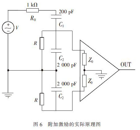如圖6 所示為附加激勵(lì)的實(shí)際原理圖。其中R是流體電阻,C1是激勵(lì)源與傳感器電極及其放大器輸入的隔直電容,C2是信號(hào)電纜的對(duì)地電容。