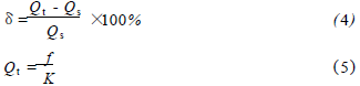 將乙烯流量計在標(biāo)準(zhǔn)水裝置上,分別用頻譜分析和脈沖計數(shù)的方法進(jìn)行標(biāo)定,流體介質(zhì)為水未加氣體,采用的標(biāo)準(zhǔn)傳感器為精度等級為0.2級的電磁流量計。在每個流量測量點上的儀表系數(shù)用公式(1)計算,然后用式(2)計算得到*終儀表系數(shù)K。Ql為被測水的流量值,f為每一個流量點得到的頻率,k為每個測量點得到的儀表系數(shù)。kmax、kmin分別為試驗流量范圍內(nèi)得到的*大與*小的儀表系數(shù)。儀表系數(shù)的線性度E1用式(3)來計算。