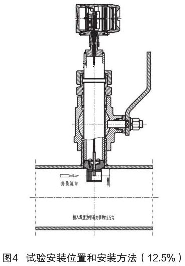 根據(jù)中華人民共和國機(jī)械行業(yè)標(biāo)準(zhǔn):JB/T9249-2015《煙氣流量計(jì)》進(jìn)行插入式煙氣流量計(jì)的研制與設(shè)計(jì)。在試驗(yàn)過程中,因?yàn)槔碚撗芯坎怀浞郑偌由辖?jīng)驗(yàn)不足,采用插入深度是按照以往其它產(chǎn)品(插入式電磁流量計(jì))的經(jīng)驗(yàn),以插入深度為現(xiàn)場管道內(nèi)徑的 12.5% 進(jìn)行試驗(yàn),其對介質(zhì)流量的檢測值與同種規(guī)格管道法蘭式結(jié)構(gòu)的煙氣流量計(jì)進(jìn)行比較,偏差值較大、儀表準(zhǔn)確度無法滿足設(shè)計(jì)要求。試驗(yàn)安裝位置和安裝方法如圖 4 所示。