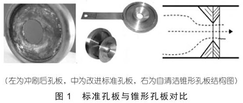 為提高計(jì)量的準(zhǔn)確性,對(duì) SAGD 實(shí)驗(yàn)區(qū)經(jīng)過(guò)長(zhǎng)期室內(nèi)及現(xiàn)場(chǎng)試驗(yàn),研制出耐磨、自清潔的錐形孔板,確定了孔板噪聲法在蒸汽干度、含贓物凝析天然氣、含液煤層氣中的應(yīng)用,解決了標(biāo)準(zhǔn)節(jié)流元件測(cè)量的原有問(wèn)題。該結(jié)構(gòu)與標(biāo)準(zhǔn)孔板相比具有壓損小、自清潔、抗磨損功能,節(jié)流件上、下游不會(huì)出現(xiàn)液相累積,避免了液相斷續(xù)通過(guò)節(jié)流件而導(dǎo)致很大附加阻力和差壓波動(dòng),影響測(cè)量精度。獨(dú)特的錐型孔板結(jié)構(gòu)和厚度的增加能有效避免孔板撓曲及氣體沖刷(圖 1)。