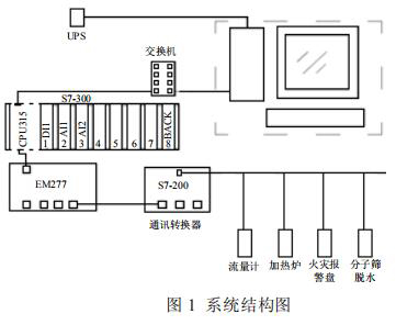 集氣站是收集氣井所生產(chǎn)天然氣的站場,在集氣站內(nèi)對(duì)天然氣進(jìn)行節(jié)流降壓、加熱、調(diào)壓計(jì)量等各種工藝預(yù)處理,設(shè)備眾多且分散。為方便進(jìn)行檢測和操作,必須進(jìn)行統(tǒng)一的數(shù)據(jù)采集,在監(jiān)控臺(tái)進(jìn)行數(shù)據(jù)的管理。集氣站設(shè)備主要包括加熱爐、高壓型電磁流量計(jì)、分子篩、火災(zāi)報(bào)警盤,以及供電設(shè)備 UPS 等,這些不同廠家的設(shè)備基本都支持Modbus 協(xié)議,通過 Modbus 通訊可以將這些數(shù)據(jù)采集。為了有效降低成本,設(shè)計(jì)了如圖 1 所示的系統(tǒng)。系統(tǒng)采用西門子 S7-300 控制器,通過以太網(wǎng)連接上位機(jī)監(jiān)控軟件,再通過 MP277 連接S7-200 的方式。S7-200 控制器自帶 RS485 接口,能夠進(jìn)行 Modbus 通訊,采集現(xiàn)場各種設(shè)備數(shù)據(jù)。*后通過以太網(wǎng)通訊將設(shè)備數(shù)據(jù)上傳至監(jiān)控軟件,方便操作人員進(jìn)行監(jiān)控,該方案簡單有效,能夠?qū)崿F(xiàn)集氣站內(nèi)設(shè)備的狀態(tài)監(jiān)控,數(shù)據(jù)處理,有效的進(jìn)行天然氣的生產(chǎn)工作。