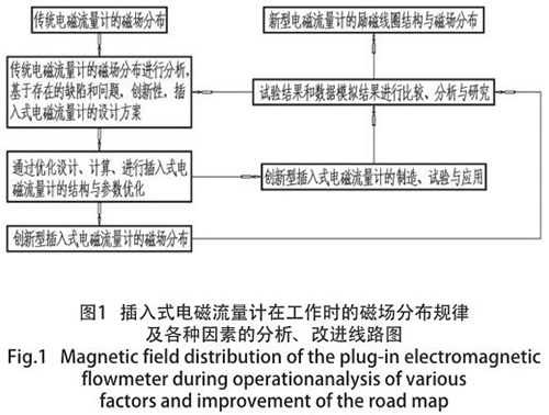 電磁流量計因其特殊的結(jié)構(gòu)形式,致使其抗干擾能力較弱、準確度偏低以及瞬時流量波動過大等不良現(xiàn)象,但便于安裝、造價低廉、普遍應(yīng)用于大管道等特點而存在。為了發(fā)揮其優(yōu)勢,消除其不利因素,對其內(nèi)部結(jié)構(gòu)及其相關(guān)技術(shù)參數(shù)進行優(yōu)化設(shè)計,從而使其準確度能夠達到 ±1% FS,使抗干擾能力得到極大地增強。本文主要通過優(yōu)化設(shè)計、選擇材料和試驗,使電磁流量計的穩(wěn)定性和準確度大幅度提高,并提出解決措施,對實際應(yīng)用具有參考價值。分析與研究程序圖如圖 1 所示。