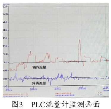 通過圖3 PLC 流量計監(jiān)測畫面可以看出,PLC 上輔汽測量用的沼氣流量計的量程設(shè)置為30t/h,現(xiàn)場設(shè)備量程實際為6t/h,兩者嚴(yán)重不符,因此測量值4t/h 為錯誤值(單臺機(jī)組運行),需要對程序進(jìn)行修改。