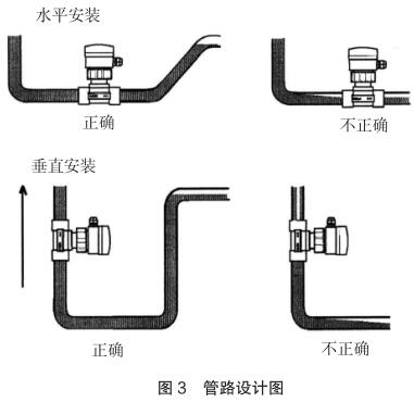現(xiàn)場(chǎng)安裝時(shí)應(yīng)注意遠(yuǎn)離可能對(duì)其產(chǎn)生干擾的大型設(shè)備,防止長(zhǎng)期的熱輻射和其他如磁場(chǎng)直射等環(huán)境影響。為確保高測(cè)量精度和較好的零點(diǎn)穩(wěn)定性,進(jìn)行校正前,智能型電磁流量計(jì)應(yīng)裝入工藝介質(zhì)中至少 24 小時(shí)電極鈍化。安裝的管路設(shè)計(jì)應(yīng)確保管道始終充滿流體,防止測(cè)量誤差,管路設(shè)計(jì)圖見(jiàn)圖 3。