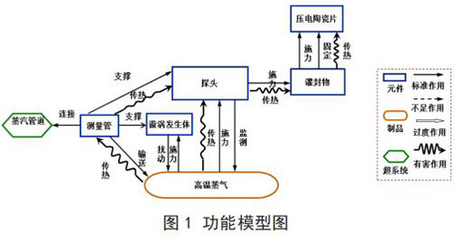 建立已有系統(tǒng)的功能模型(見(jiàn)圖 1)。通過(guò)功能模型分析,描述了系統(tǒng)元件及其之間的相互關(guān)系,并得出導(dǎo)致傳感器耐受溫度不足問(wèn)題的功能因素:高溫蒸氣對(duì)測(cè)量管傳熱;測(cè)量管對(duì)探頭傳熱;探頭對(duì)灌封物傳熱;灌封物對(duì)壓電陶瓷片傳熱;高溫蒸氣對(duì)探頭傳熱。