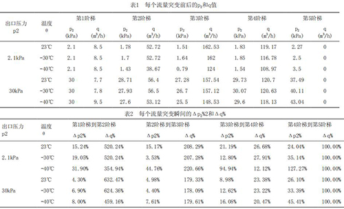 為了深入研究溫度及流量突變對(duì)高溫液體流量計(jì)響應(yīng)速度的影響趨勢(shì),把每個(gè)流量突變點(diǎn)前后的出口壓力p2,流量q列表如表1所示。