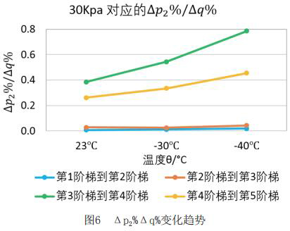 為了更直觀嚴(yán)謹(jǐn)?shù)膶?duì)比每個(gè)階段響應(yīng)速度的不同,對(duì)原始數(shù)據(jù)進(jìn)行處理,得到如下表格2和表格3。將△p2%/△q%作為響應(yīng)速度的直觀量化表達(dá),若△p2%/△q%的值大,說(shuō)明單位流量變化照成的出口壓力變化大,即說(shuō)明高溫液體流量計(jì)響應(yīng)相對(duì)較慢,反之亦然。