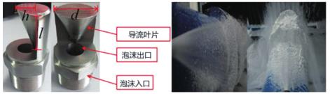 圖 1 為電弧風扇噴嘴的結構和噴霧,一種新型的噴嘴主要由一個衛(wèi)生型渦街流量計入口、出口和導流葉片組成。出流口的圓柱形設計降低了湍流強度。導流葉片類似于流線型尾部,產生類似于弧形風扇形狀的衛(wèi)生型渦街流量計噴霧,其形狀類似于掘進機的粉塵源。