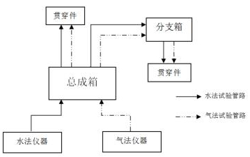 安全殼遠(yuǎn)傳渦街流量計以總成箱和分支箱為核心。試驗(yàn)初期,將總成箱置于儀器放置區(qū),分支箱置于貫穿件集中區(qū)域附近,檢漏儀至總成箱再至分支箱之間的管線固定連接,如圖2所示。水法試驗(yàn)管路與氣法試驗(yàn)管路互相獨(dú)立,總成箱和分支箱的每一路連接采用編號標(biāo)記進(jìn)行區(qū)分,并設(shè)置控制閥控制開關(guān)和流向。