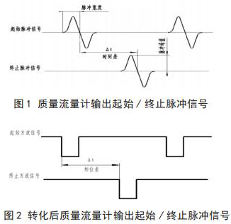 將智能型電磁流量計(jì)流量與相關(guān)測(cè)試設(shè)備連接起來(lái),就可以進(jìn)行智能型電磁流量計(jì)的校準(zhǔn),時(shí)間差△ t 由專用試驗(yàn)測(cè)試設(shè)備可以測(cè)出。起始脈沖信號(hào)和終止脈沖信號(hào)如圖 1 所示。經(jīng)過(guò)專用試驗(yàn)測(cè)試設(shè)備信號(hào)轉(zhuǎn)化后的信號(hào)方波如圖 2 所示。
