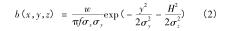 式中: b(x,y,z) = w × e(x,y,z),其中 e(x,y,z) 為二氧化硫濃度與循環(huán)流化床火炬氣流量計(jì)煙氣排放源煙氣強(qiáng)度的比例系數(shù);f 為平均風(fēng)速,m/s; w 為地面空氣內(nèi)煙氣排放強(qiáng)度;σ x 為橫向擴(kuò)散系數(shù)受環(huán)境穩(wěn)定度與下風(fēng)向距離因素的影響程度。式(3)中描述的是基于時(shí)間變化的循環(huán)流化床火炬氣流量計(jì)煙氣排放源煙氣排放強(qiáng)度計(jì)算模型。