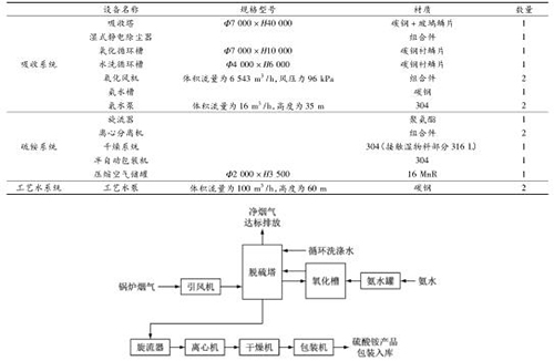 工藝系統(tǒng)主要包括煙氣系統(tǒng)、SO 2 吸收系統(tǒng)、吸收劑供給系統(tǒng)、氧化空氣系統(tǒng)、硫酸銨后處理系統(tǒng)、工藝水系統(tǒng)、檢修排空系統(tǒng)、硫酸銨儲存系統(tǒng)(見表 4)。