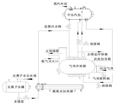 來(lái)自無(wú)離子水罐的脫氧水經(jīng)多經(jīng)泵加壓、經(jīng)脫氧水加熱器加熱后進(jìn)入到液體渦街流量計(jì)的水段,脫氧水與反應(yīng)氣體換熱后分兩路:一路進(jìn)入中壓汽包,保證汽包有穩(wěn)定的液位;一路進(jìn)入熔鹽冷卻器帶出熔鹽攜帶的反應(yīng)熱。來(lái)自中壓汽包的高溫水經(jīng)管路接至液體渦街流量計(jì)汽段底部,高溫水與反應(yīng)氣體換熱后產(chǎn)生高壓蒸汽,高壓蒸汽又返回中壓汽包。汽包還有一路直接注水管路,此路水不經(jīng)過(guò)液體渦街流量計(jì)水段,而是直接進(jìn)入汽包。在液體渦街流量計(jì)出口溫度偏低而汽包液位也比較低時(shí),可開此直接注水管路來(lái)穩(wěn)定汽包液位。其詳細(xì)流程圖如圖 2。