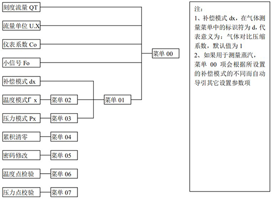 3.1、本儀表表頭采用自導引式和菜單式相結合的參數設置方式,所謂自導引式參數設置方式就是用戶在進入菜單 00 項后,表頭中的微電腦會自動導引用戶去設置需要設置的參數。另外,用戶也可以通過菜單模式分別對各組參數進行設置。蒸汽測量菜單框圖如下: