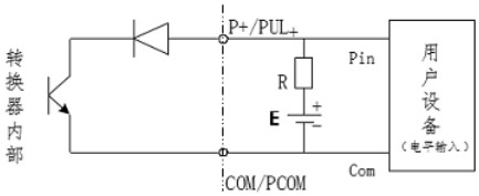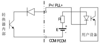 PUL+/ P+、ALM+(AH)、ALM-(AL)和 PDIR(FDIR)均為集電極開(kāi)路(OC 門)輸出(參閱圖 3.6b、3.6d,用戶接線時(shí)必須參照如下電路外接電源和負(fù)載: