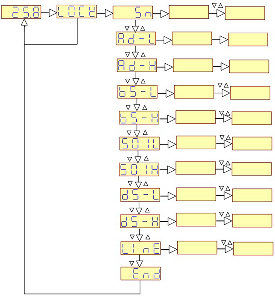 菜單 AD-L 和 AD-H 為變送器采集菜單,此菜單數(shù)據(jù)無需輸入,按 SET 進(jìn)入數(shù)據(jù)采集 以后顯示的是上次采集到的數(shù)據(jù),十進(jìn)制顯示,按位選鍵或者增加鍵開始采集,此時(shí)需要根 據(jù)需要輸入需要采集的電阻值即可,按 SET 保存并返回菜單狀態(tài)。