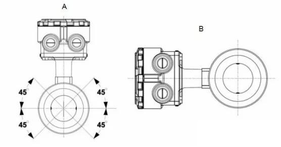 如果兩個測量電極處于 3 點鐘和 9 點鐘位置或與水平方向成 45 度以下角度,如 圖 3-4 左側(cè)所示,則傳感器電極的朝向正確。避免使傳感器的頂部與垂直位置成 90 度角(如 圖右側(cè)所示)的任何安裝朝向。