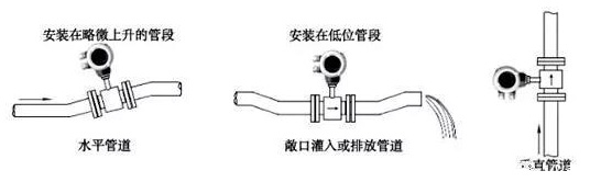 流量計(jì)可以水平、垂直和傾斜安裝。但是管路結(jié)構(gòu)應(yīng)保證測(cè)量管必須始終充滿液體(滿管)。管路設(shè)計(jì)時(shí)注意確保測(cè)量管段無(wú)氣泡,否則將會(huì)造成測(cè)量不穩(wěn)定和偏差過(guò)大。