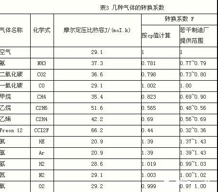 2) 不同氣體間流量換算 有些制造廠的使用說(shuō)明書(shū)給出以空氣為基數(shù)的轉(zhuǎn)換系數(shù)f,可按式6換算;也可直接以標(biāo)定(校準(zhǔn))氣體和實(shí)際使用氣體的摩爾定壓比熱按式6換算,但因還有熱導(dǎo)率等其他因素,換算后精度要降低些。表3給出若干氣體按摩爾定壓比熱容直接計(jì)算和若干制造廠提供的兩種轉(zhuǎn)換系數(shù)數(shù)據(jù),其中freon12兩者差別較大。