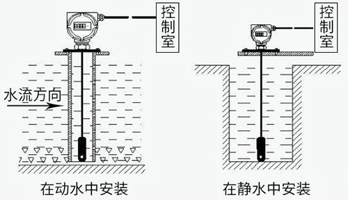 投入式靜壓液位計(jì)(靜壓式水位計(jì))通常投入直徑大于水位計(jì)直徑的的PVC管、鋼管,管道固定在水中,不同高度打若干小孔,以便水通暢進(jìn)入管內(nèi)?;蛘咴诘撞考友b阻尼裝置,以過(guò)濾泥沙和消除動(dòng)態(tài)壓力和波浪對(duì)測(cè)量的影響。
