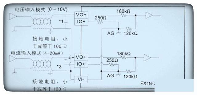 上圖是三菱PLC的一塊模擬量輸入模塊,只有兩種模擬量信號輸入,一路是電壓信號輸入、一路是電流信號輸入模,而且此模塊不能同時用于兩種信號工作。由題目可知現(xiàn)場超聲波液位計輸出的是電流信號,因此將模擬量輸入模塊選擇電流信號輸入模式。由于使用的是電流信號輸入模式,要將圖中所示的VO+和IO+進行短接。而VI-是接電壓信號或電流信號的公共端子。