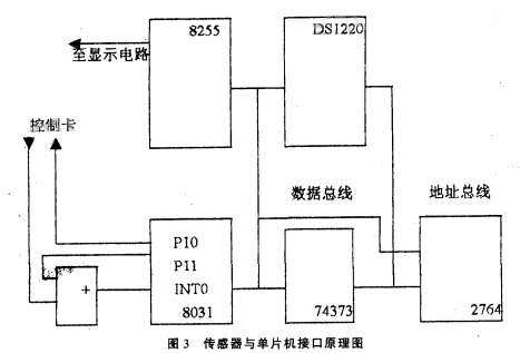 圖3中,單片機8031、74373和2764組成單片機核心電路,8255為顯示電路接口,DSl220為不揮發(fā)RAM,用其存儲流量可保證斷電后流量不丟失。工作時8031每隔一個采樣周期先啟動定時器T1,然后通過PIO引腳向控制卡發(fā)控制信號,換能器發(fā)一聲波經(jīng)被測污水反射由換能器接收,控制卡的邏輯輸出端輸出一脈沖,脈沖信號經(jīng)過或門進入INTO腳,引起中斷請求。在中斷服務(wù)程序中從定時器中取出定時值,計算出對應(yīng)的液位。由于傳感器在發(fā)出聲波后,在4MS以內(nèi)會產(chǎn)生無用的盲區(qū)脈沖,所以在P10向控制卡發(fā)控制脈沖的同時,通過P11引腳發(fā)一個4ms的高電平封鎖信號,防止“盲區(qū)脈沖”通過或門進入INTO引腳。
