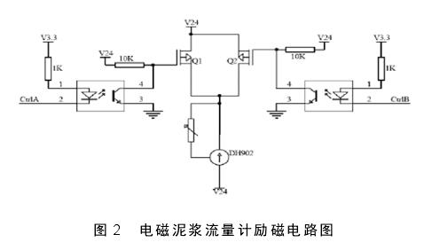 圖中的勵磁電路工作內(nèi)容是控制儀表的工作磁場。其作用原理為 :單片機 MSP430F2418 定時器產(chǎn)生了雙頻矩形波,并經(jīng)光耦隔離后與兩片場效應管組成了開關(guān)電路,從而實現(xiàn)了泥漿流量計使用的通斷功能。另一個電路 DH902 是恒流管,其為設(shè)備使用提供恒定的勵磁電流。具體來說,當 MCU 定時器的脈沖寬度調(diào)制(PWM)輸出后,經(jīng)過濾波就能有效控制勵磁電流的幅值,進而產(chǎn)出雙頻矩形波。如圖 2 所示,為電磁泥漿流量計勵磁電路圖。