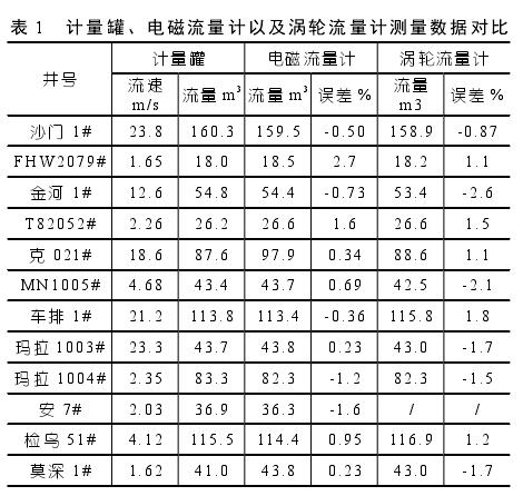 以內(nèi)徑為 DN50 的電磁泥漿流量計應用固井測量過程為例,技術(shù)應用人員將高壓由壬接入泥漿管線。此過程,測量人員要將其與串接的渦輪流量計進行分析比較,以實現(xiàn)標準計量罐測試的準確性目標。設(shè)備應用人員將計量鉆井泥漿的密度范圍控制在 1.15~2.50 g/cm3之間,而對于固井施工現(xiàn)場一次性替漿量,技術(shù)人員應將其控制在 18~160 m3之間,替漿瞬時流量則應控制在 0.2~2.8 m3/min 之間。如表 1 所示,為某固井采用計量罐、電磁流量計以及渦輪流量計的數(shù)據(jù)對比。
