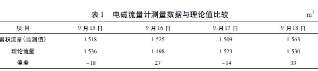 電磁流量計與V錐流量計都適用于環(huán)境較惡劣的場合。在測量精度上,V錐流量計要比電磁流量計高,而且安裝更靈活,對上、下游直管段的要求很短,但V錐流量計要比電磁流量計昂貴得多。電磁流量計的測量精度雖不及V錐流量計,但在此應(yīng)用中完全可以滿足要求,而且運行穩(wěn)定性和流量數(shù)據(jù)準確度也很好。表1是使用電磁流量計對園區(qū)某個企業(yè)監(jiān)測點連續(xù)4天的累積流量監(jiān)測數(shù)據(jù)與理論流量的對比。