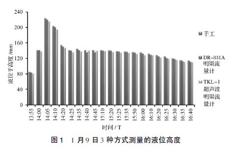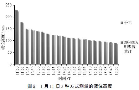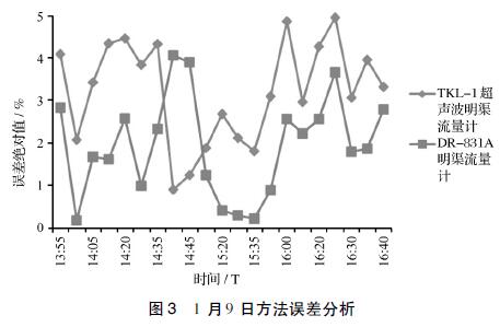 見圖3,以手工實測液位高度為基準,2種流量計的誤差均在±5%的范圍內(nèi)。除在1月9日14:40和14:45兩個時間點測量值表現(xiàn)出DR-831A測量誤差高于TKL-Ⅰ外,其他時段都明顯表現(xiàn)出DR-831A測量誤差小于TKL-Ⅰ。