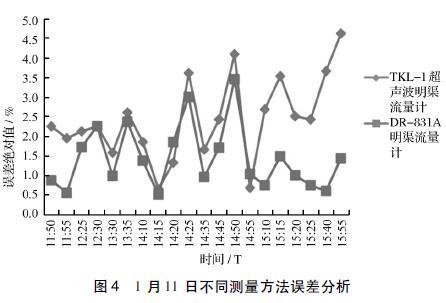 由圖4可知,以手工實測液位高度為基準,2種流量計的誤差均在±5%的范圍內(nèi)。1月11日12:30~14:55期間,DR-831A和TKL-Ⅰ測量誤差比較接近。其他時段,2者呈現(xiàn)出前者測量誤差要小于后者測量誤差。