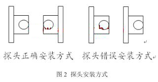 d.探頭安裝時要注意方向。該廠流量計一度頻頻歸零,起先找了很多原因,如給流量計井做防水,更換耦合劑等,但是效果并沒有大的改善。結(jié)果是雖然頻頻更換耦合劑,但二次表中信號強度*好僅能達(dá)到44dB,且信號強度不穩(wěn)定,浮動較大,導(dǎo)致流量不夠準(zhǔn)確。有時甚至涂抹一次耦合劑只能正常顯示數(shù)據(jù)一天時間。后來發(fā)現(xiàn)一個探頭在兩根鋼帶內(nèi)側(cè),另一個探頭在兩根鋼帶外側(cè),而兩個探頭應(yīng)該同在兩根鋼帶內(nèi)側(cè),如圖2所示。錯誤安裝方式的結(jié)果是聲波信號接收效果不好。將安裝方式更改之后,信號強度*好能達(dá)到70dB,并穩(wěn)定在60-70dB之間,從而保證了流量數(shù)據(jù)的準(zhǔn)確性。