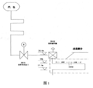 異形孔板安裝在鍋爐30米處連排管段,截去一段加裝U形管段的來(lái)流直管段上,根據(jù)安裝要求,測(cè)點(diǎn)位置選在距離上游直管段1810mm,距離下游直管段1085mm處。符合“距離上游直管段>10D(D=56mm,管道內(nèi)徑),距離下游直管段>5D”的要求。孔板的取壓管為垂直向下,圓缺孔板的弦與管道橫截面水平中心線平行安裝。其改造安裝圖如圖1所示。
